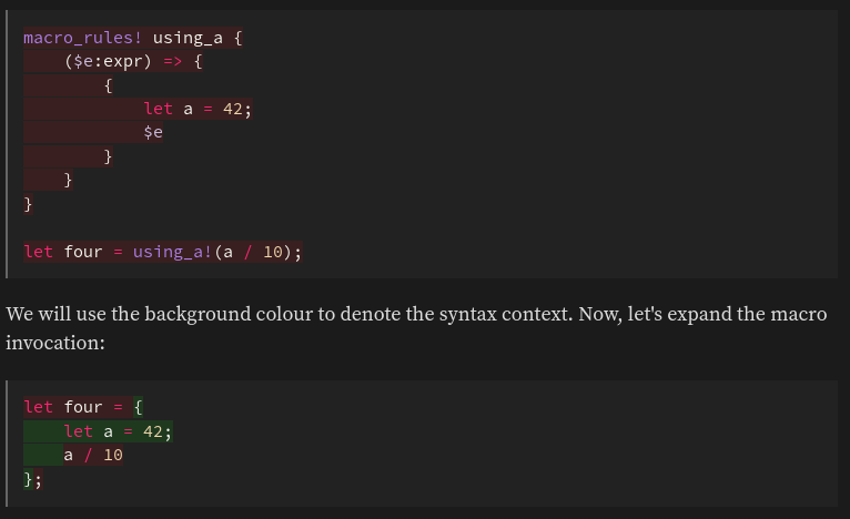 macro_rules!) - Не са хигиенични - за разлика от нормалните макроси се повлияват от кода около тях