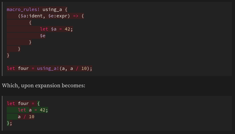 macro_rules!) - Не са хигиенични - за разлика от нормалните макроси се повлияват от кода около тях